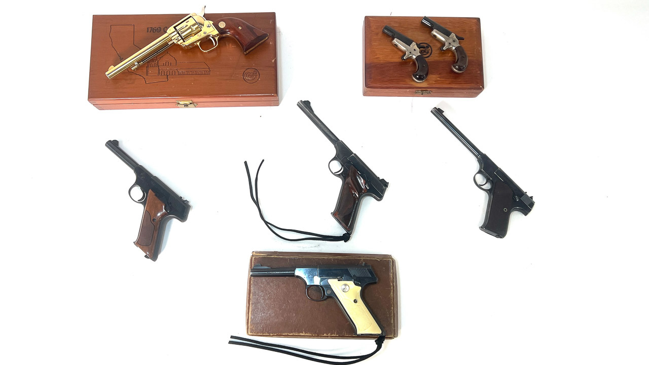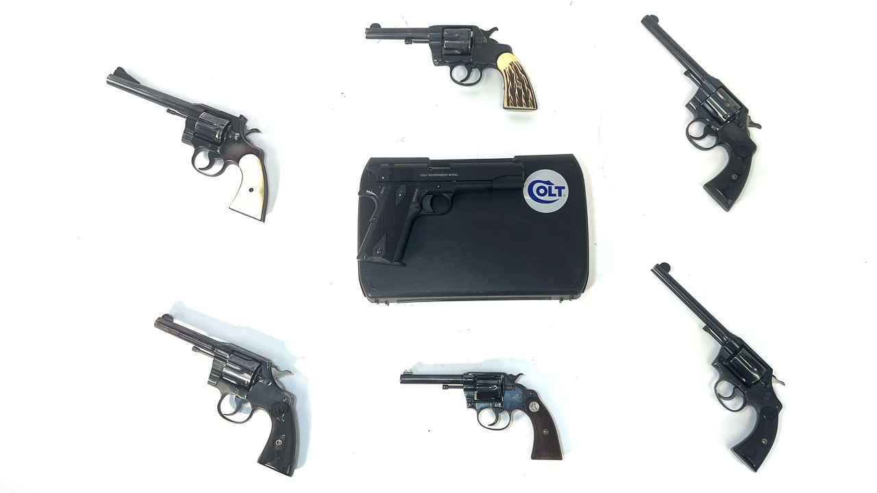 Handguns. Colt Model: Pair of Derringer, 22 Short; Frontier Scout, 22 cal.; (2) Anaconda 44 mag.; 357, 357 mag.; Python, 357 mag.; (2)Government, 22 & 45 cal.; King Cobra, 357 mag.; (2)Gold Cup, 45 cal.; All American 2000, 9 mm; (3)Army Special, 38 & (2) 32/20 cal.; Police Positive 38 sp.; DA 32, 32 cal.; DA 41, 41 cal.; (3) Woodsman, 22 cal.; Auto, 25 cal.; Huntsman, 22 cal.; Detective Special, 38 sp.