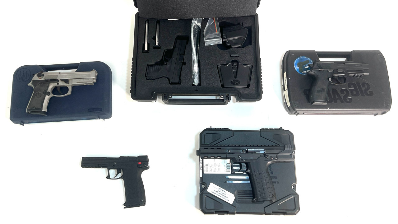 Beretta Models: 92 FS, 9 mm; 3032 Tomcat, 32 cal.; 1952, 7.65 cal.; (2)950BS, 22 short; (2)9000 S, 9 mm & 40 S&W.