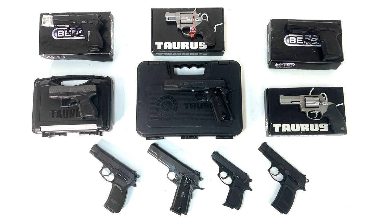 Taurus Models: (2)M 605, 357 mag.; 85, 38 sp.; (2)PT 1911, 45 cal.; GX 4, 9 mm; (2) PT 22, 22 cal.; 66,357 mag.; 441, 44 sp.; PT 111 G2, 9 mm; 80, 38 sp.; G3C, 9 mm.
